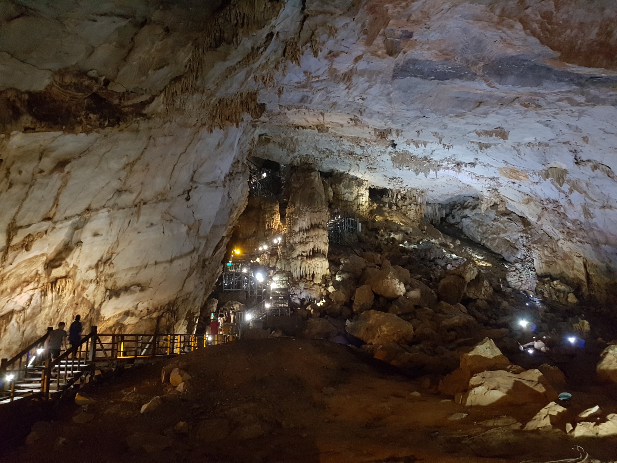 Dong Hoi ist eine kleine Stadt an der Ostküste von Vietnam, keine 200000 Einwohner leben hier was für asiatische Verhältnisse schon sehr ungewöhnlich ist. Wir haben eine Unterkunft mit Blick auf das Meer, aktuell beginnt auch hier der Herbst was bedeutet das die vielen Hotels an der Promenade sehr wenig besucht sind. Aber Dong Hoi ist sehr wahrscheinlich die jüngste Stadt die wir jemals besucht haben. Im Vietnamkrieg vollständig (!) zerstört begannen erst Ende der 1980er Jahre die Leute sich wieder anzusiedeln, jedes einzelne Haus in der Stadt ist nicht älter als 30Jahre. Als wir abends über die Promenade heim gelaufen sind saßen viele Vietnamesen am Strand, was wirklich beeindruckt ist dieses gemeinsam essen, viele kochen auch direkt auf der Straße oder genießen HotPot (etwa wie Eintopf). Gestern waren wir auf Tagestour im der sogenannten Paradise Cave, eine Höhle die 2005 zufällig von einem Einheimischen entdeckt wurde und seit 10Jahren für Besucher geöffnet ist. Nach einer ca. 20minütigen Wanderung auf den Berg gehts über eine kleine Treppe hinunter in das ‚Innere‘, ich war wirklich schwer beeindruckt wie lange nicht mehr. Überall Stalaktiten, Verformungen und wunderschöne Gebilde aus Stein, das Ganze zog sich ca. 1km in die Höhle hinein. Sehr surreal alles und so ruhig denn aktuell ist Nebensaison, d.h. nach dem Sommer folgt in Vietnam die Regenzeit, wie ihr sicher auf den Fotos bemerkt habt gibt kaum Touristen. Wenn welche neben uns da sind kommen die meist aus Holland und Frankreich. Heute ging es dann weiter über die ehemalige Grenze in den Südteil Vietnams, kurz zuvor habe wir Halt in Vinh Moc gemacht (https://de.m.wikipedia.org/wiki/Vinh-Moc-Tunnel) und Julia konnte die Tunnel, die während des Vietnamkrieges gebaut wurden, von innen besichtigen. Da Asiaten alle gefühlt einen Kopf kleiner als ich sind bin ich nach paar Metern wieder umgekehrt, es war einfach zu eng für mich da drin. Die Tunnel existierten in 3 Ebenen, zur Evakuierung für Menschen (ganz oben), für die von Waren (in der Mitte) und darunter die Waffen zur Verteidigung gegen die GI’s. Die oberste Ebene lag bei 11 Metern unter der Erde und ein verzweigtes System von insgesamt 42km wurde in weniger als 3 Jahren ausgehoben. Ich habe mir derweil die Fotos und Überreste von damals angeschaut und kann mir immer noch nicht vorstellen unter welch krassen Bedingungen die Menschen damals hier gelebt und jeden Tag hart gearbeitet haben um zu überleben. Damit war unsere Reise durch den Nordteil Vietnams beendet und wir kamem über eine Brücke (die ehemalige Grenze) in den Süden. Aktuell sind wir in Hue, es fiel sofort auf das diese Stadt westlicher geprägt ist und durch die vielen Pubs und die lauten Bars kam ich mir teilweise vor wie an der Khao San Road in Bangkok (die Partymeile Asiens schlechthin). Heute gehts dann weiter nach Hoi An.